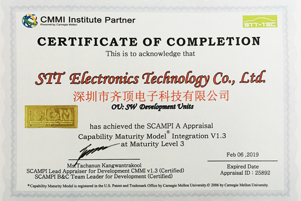2016年1月份,在齊頂科技CMMI3級認(rèn)證結(jié)果發(fā)布會(huì)上,主任評估師宣布:深圳市齊頂電子科技有限公司已經(jīng)達(dá)成了CMMI3級目標(biāo),成功通過CMMI3級認(rèn)證。這是齊頂電子在軟件開發(fā)和管理標(biāo)準(zhǔn)方面發(fā)展的里程碑,標(biāo)志著公司的軟件能力成熟度和項(xiàng)目管理水平與國際主流模式接軌。