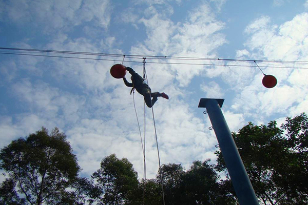 學(xué)員爬上7米高的跳臺,在跳臺上奮力跳出拍打汽球。這個項(xiàng)目主要訓(xùn)練學(xué)員克服心理障礙、建立良好的心理素質(zhì)及自信心,果斷的